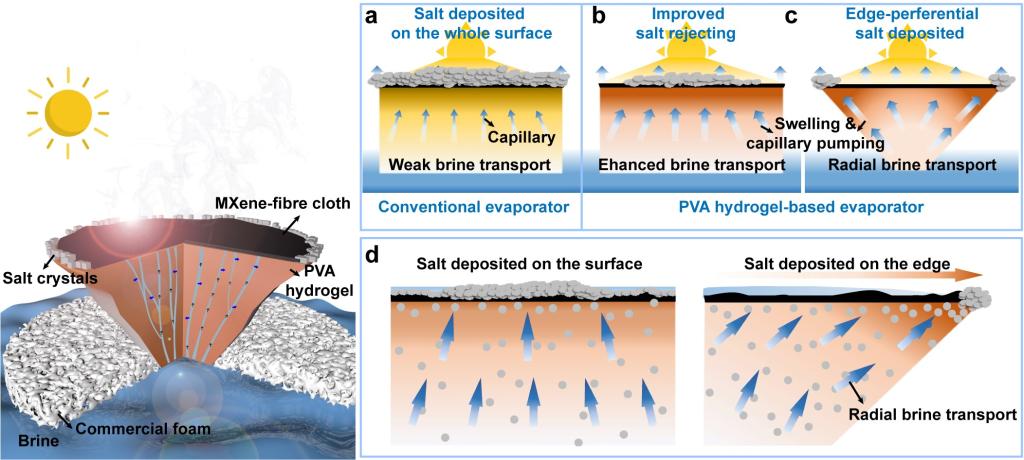 图1.三维水凝胶基蒸发体结构和边缘析盐工作原理示意图
