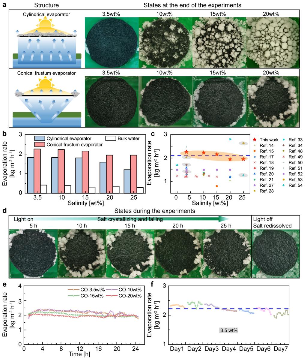 近日,该研究团队的唐大伟教授、李林副教授等人设计了一种三维水凝胶基蒸发体,通过微米级水输送调控有效增强了水分的径向输运,使其边缘溶液浓度升高实现盐分仅在三维锥形蒸发体的边缘析出,从而使蒸发主表面始终保持清洁,获得了长时间稳定、高效的蒸发性能。研究表明,该蒸发体在10-20 wt%高浓度盐水中连续光照,其光热表面无盐分沉积,蒸发性能稳定在2.07 kg m−2 h−1,是当前已报道文献的最佳值之一。此外,在真实海水浓度条件下可实现连续7天平均2.22 kg m−2 h−1的高效蒸发,优于目前大多数耐盐蒸发体。该研究为困扰太阳能界面蒸发的表面积盐问题提供了新的抗盐策略,为构建长期稳定、高效的界面蒸发结构提供了新思路。