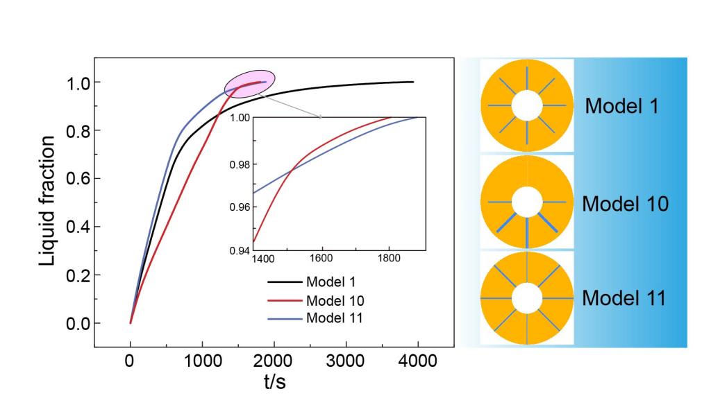 金属翅片结构简单、导热系数高,能够有效提升储热系统效率。现阶段的新型翅片虽然能够强化储热效率,但同时牺牲了系统的储热密度。本团队针对传统翅片结构进行结构优化设计,在不增加甚至减小翅片容积的前提下,仍能实现储热效率的提升。对于径向翅片结构,以协同强化导热和对流换热为基础,通过缩短顶部翅片、延长底部翅片的方式,有效提升底部区域的融化速率,从而显著提升整体储热速率(5~45%),而这种优化结构对储热密度的影响可忽略不计。对于传统环形翅片,可通过打孔的方式增强翅片间的对流换热,从而实现储热效率(4~12%)和储热密度(0.21%)的共同提升。