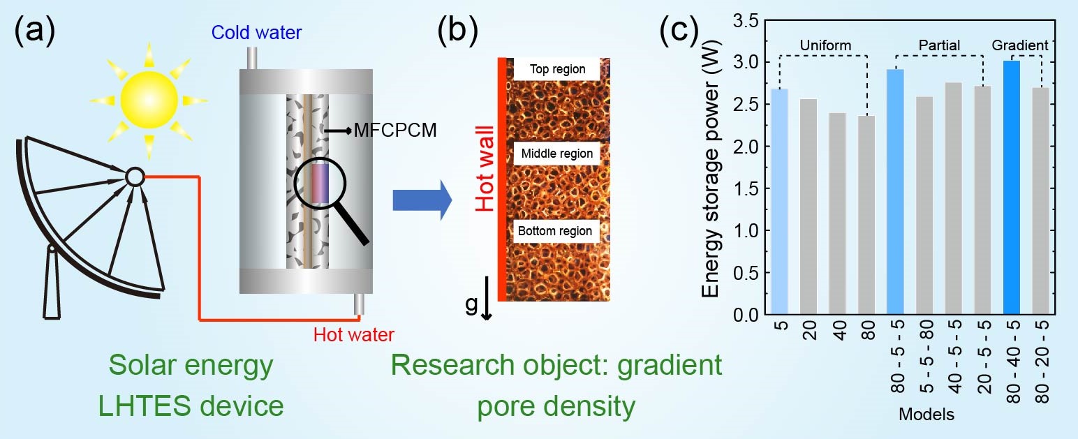 图1. (a)太阳能储热系统(b)优化孔径泡沫结构(c)储热功率