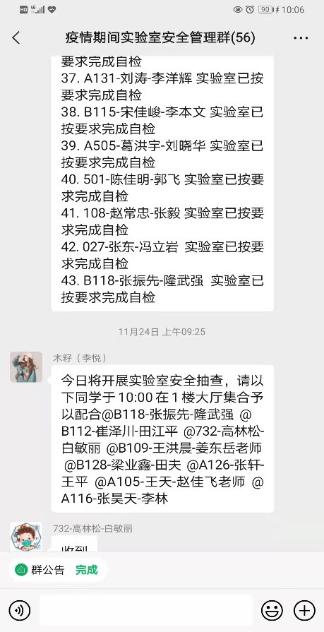 因疫情管控的要求,教师无法时时监督实验室安全管理情况,为此,学院建立实验室安全管理学生自查制度,组成学生安全专员小组,形成学院-责任人-学生三重管理。严格遵守实验室每日巡检制度,并于每日完成实验室工作后,在实验室管理群中上报自查情况,确保每日实验安全管理工作有总结、有反思。本次参加实验室安全管理自查工作的学生人数接近50人,实现了安全管理人人有责,人人尽责的良好局面。