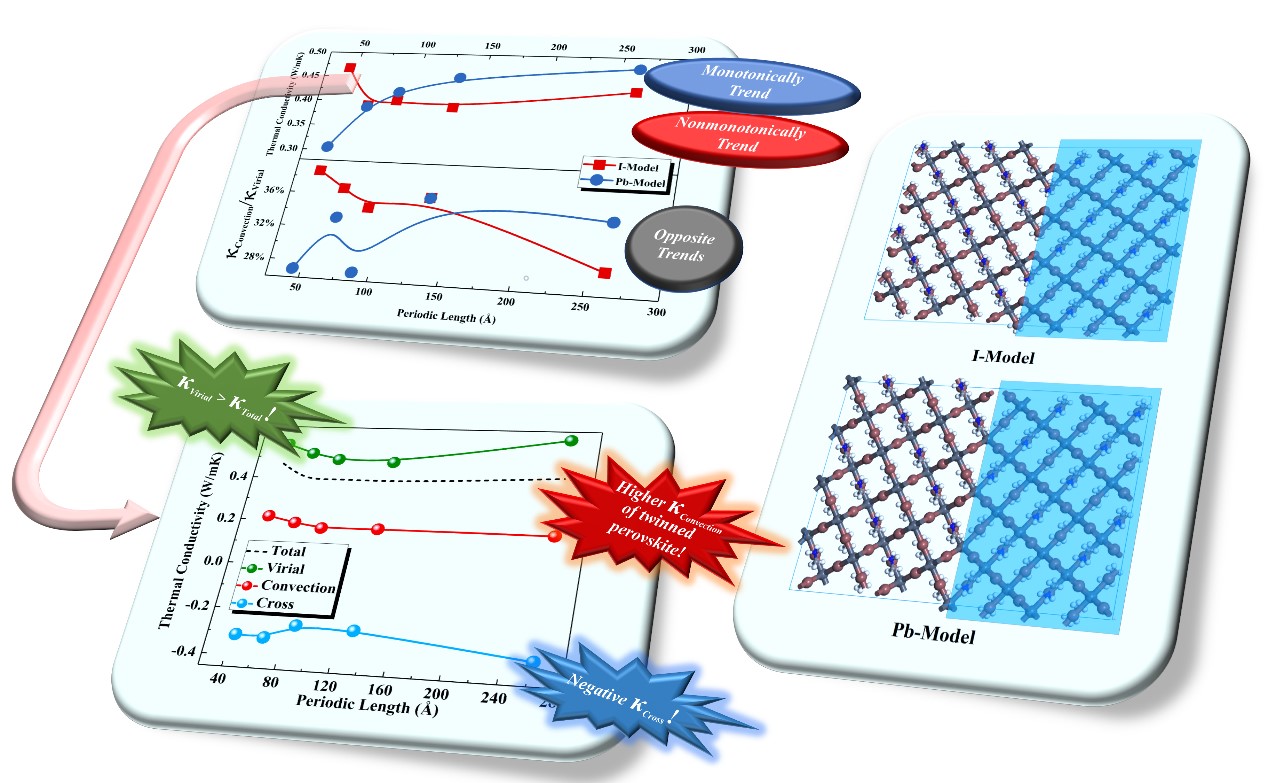 考虑到纳米孪晶将打破固体晶格固有的周期性,并将在液体分子的运动过程中产生重要的影响,研究团队将纳米孪晶引入CH3NH3PbI3中,通过定量标定多种热输运方式对热导率的贡献分析了单晶和孪晶钙钛矿的热输运性能。研究表明:(1)单晶钙钛矿中的固体振动传热在高温下依然占主导地位;流体对流传热的比重占到固体传热的20-30%,但流体对流传热过程几乎未表现出温度依赖性;而流固耦合传热过程则表现出奇异的负热导率。(2)孪晶的引入将增强钙钛矿的对流传热热导率;其还将使流固耦合热导率表现出更显著的负值,在其影响下孪晶钙钛矿的总热导率甚至低于其晶格振动热导率;此外,孪晶钙钛矿中晶界的位置对热导率的调控也有着重要的意义。