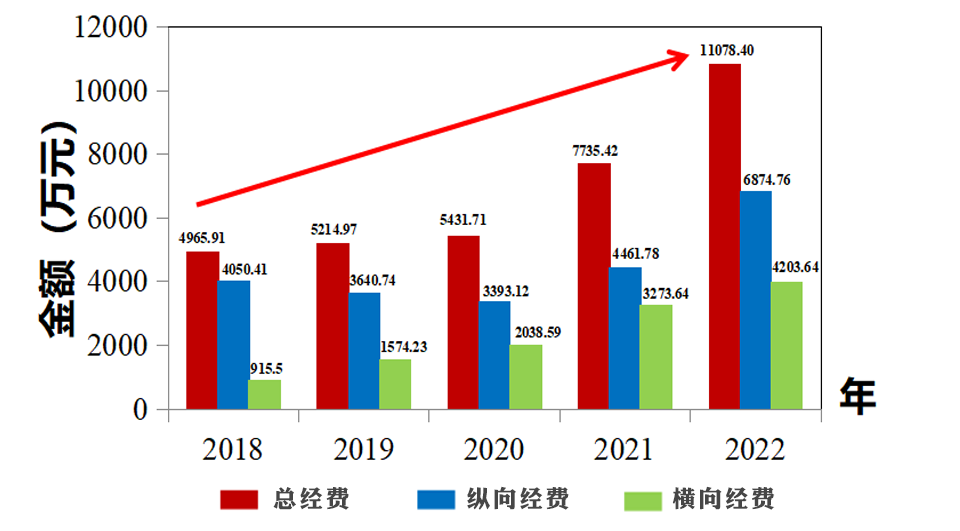 学院总经费连续五年趋于平稳上升态势,2022年横、纵向经费均达到历史新高,横向增长率 22.7%、纵向增长率 53.3%。人均科研进款108万元,服务国民经济主战场能力持续提升。