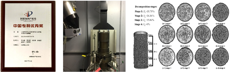 该专利攻克了高压低温压力室复杂结构设计与X射线强度衰减等一系列技术挑战,首次实现了高荷载、高压、低温条件下水合物储层岩心三维表征,打破了传统水合物三轴仪“实验黑箱”。