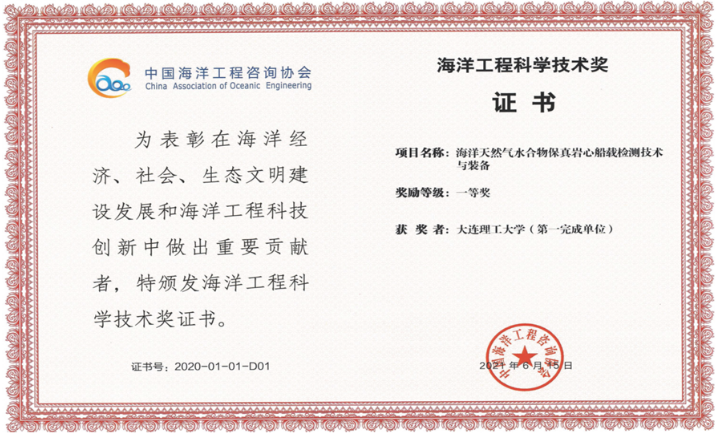 宋永臣教授主持完成的“海洋天然气水合物保真岩心船载检测技术与装备”获海洋工程科学技术一等奖。