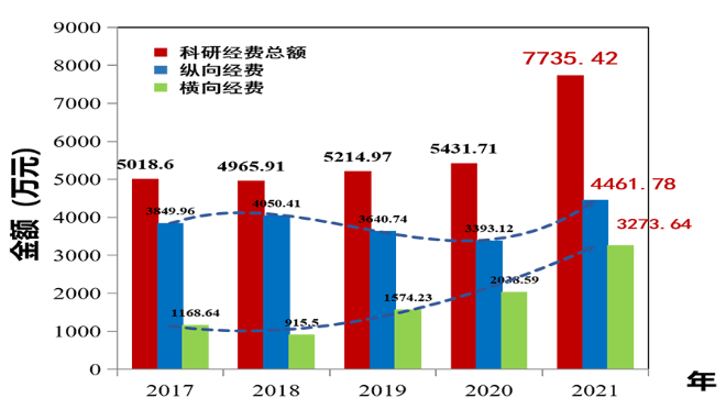 1、总体经费情况:近年来学院总体经费趋于平稳上升态势,在2021年实现较大幅度提升,科研经费首次突破7000万元,增幅为42.4%;