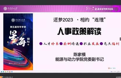 一元复始,万象更新。2月6日16:00,2023年大连理工大学星海论坛—能源与动力“云”论坛如期举行,身处海内外的12名青年才俊“云”端相聚、在线畅谈,为能源与动力学院2023年人才队伍建设工作“加速跑”打响了第一枪。论坛由学院党委副书记陈家模副研究员、分管科研工作副院长陈聪教授共同主持。能源与动力学院院长杨明军教授、优秀青年教师代表李羽白教授、学院部分师生等近30人参加了此次论坛。
