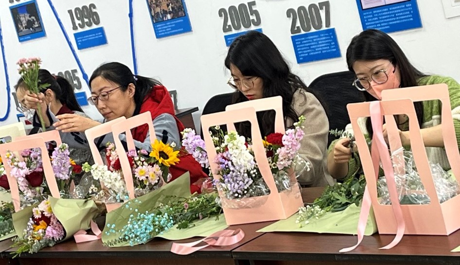 跟芬芳鲜花伴着的是学院女教师冻龄的容颜、灿烂的笑容;在花卉基础知识探讨中看到的是能动女神们专注的精神、好学的品格;在插花技巧教学中展现的是能动女教工们灵巧的双手,创意的思维。