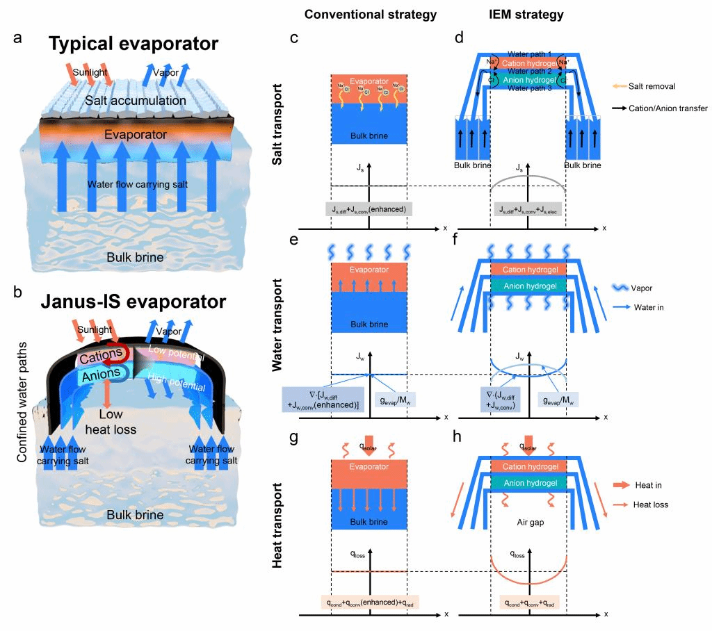 太阳能界面蒸发是一种新兴的绿色低碳海水淡化技术。然而,该技术当前存在蒸发速率低、表面易积盐等瓶颈。传统的抗积盐方法是通过强化水的对流来运移盐离子,但加快对流不仅会从蒸发表面带走盐分,还会带走热量,抑制蒸发速率。为此,李林副教授等人借鉴电鳗肌肉异质细胞间内建电场的原理,提出了通过驱动阴阳离子反向传递,主动形成内部电场来驱动离子运移的排盐模式。通过模仿电鳗细胞结构,构建了由双层异质离子选择透过性水凝胶和受限水路层叠组成的蒸发器,实现了Na+和Cl-在蒸发器内反向传递,从而形成内建电场。在内建电场和层叠水路的共同作用下,实现了电迁移、扩散和对流的协同强化,加速了盐离子传递和高效排除。显著提高了蒸发器的抗积盐耐久性,并大幅降低了热损失,在连续抗积盐的同时获得了高达6.8 kg m-2 h-1的蒸发速率,是目前已报道的最高性能,突破了界面蒸发领域的性能瓶颈,为设计下一代高效、长期稳定的界面蒸发器提供了全新思路。本研究得到了国家自然科学基金面上项目(No. 52076028)的支持。
