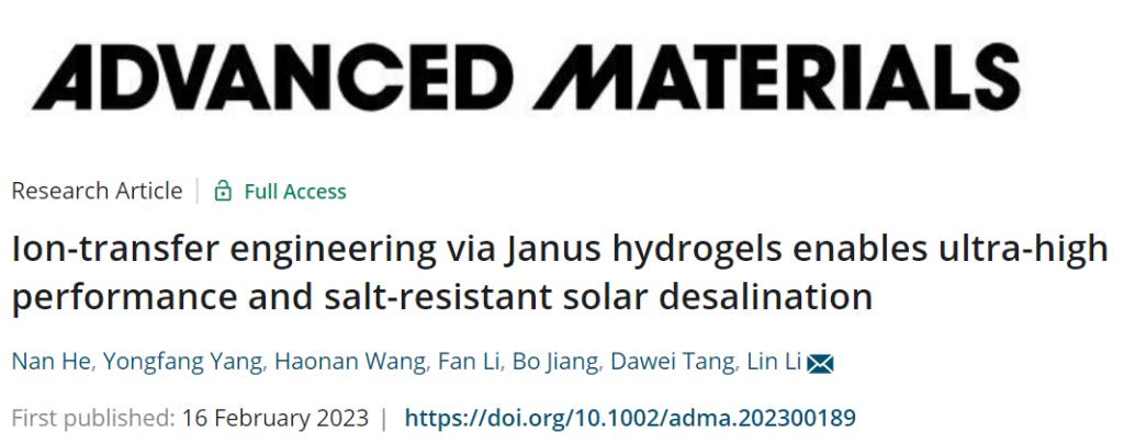 近日,李林副教授、唐大伟教授等人在太阳能界面蒸发海水淡化领域取得突破性进展,在国际顶级期刊《Advanced Materials》(IF: 32.086)发表了题为“Ion-transfer engineering via Janus hydrogels enables ultra-high performance and salt-resistant solar desalination”的研究型论文。我校是本研究的唯一完成单位。论文第一作者为我院2021级博士生贺楠,通讯作者为李林副教授。