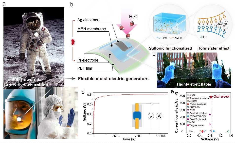 为解决上述问题,该团队聚焦于水凝胶聚合物材料,其不仅拥有良好的柔韧性,而且内部具有大量的微纳结构和官能团,可吸附并储存大量水分。然而,这种柔性材料的离子传导率较差,难以直接用于湿电转化。为此,该团队提出了一种水凝胶分子工程策略,通过在其单个聚合链分子结构上进行微观设计,显著提高了水凝胶的离子传导特性和可拉伸性。该分子工程策略是将磺酸基团和锂离子嵌入到聚合链分子结构中。其中,磺酸基团赋予聚合链更稳健的分子结构及电离特性,而锂离子能够诱导产生霍夫迈斯特效应,拓宽聚合链之间的间距并构建出大量的离子传输通道。基于分子工程水凝胶构建的湿气发电器获得了高达480 μA cm-2的短路电流密度,是大多数已报道的湿气发电器的十倍以上。同时,其可承受500%以上的拉伸形变而不被破坏,是目前已报道的湿电转化材料的最高水平。该湿气发电器能够将人体呼吸过程中产生的湿气转化为电能,为电子设备提供动力。该工作推动了湿气发电技术向可穿戴电子设备的应用。