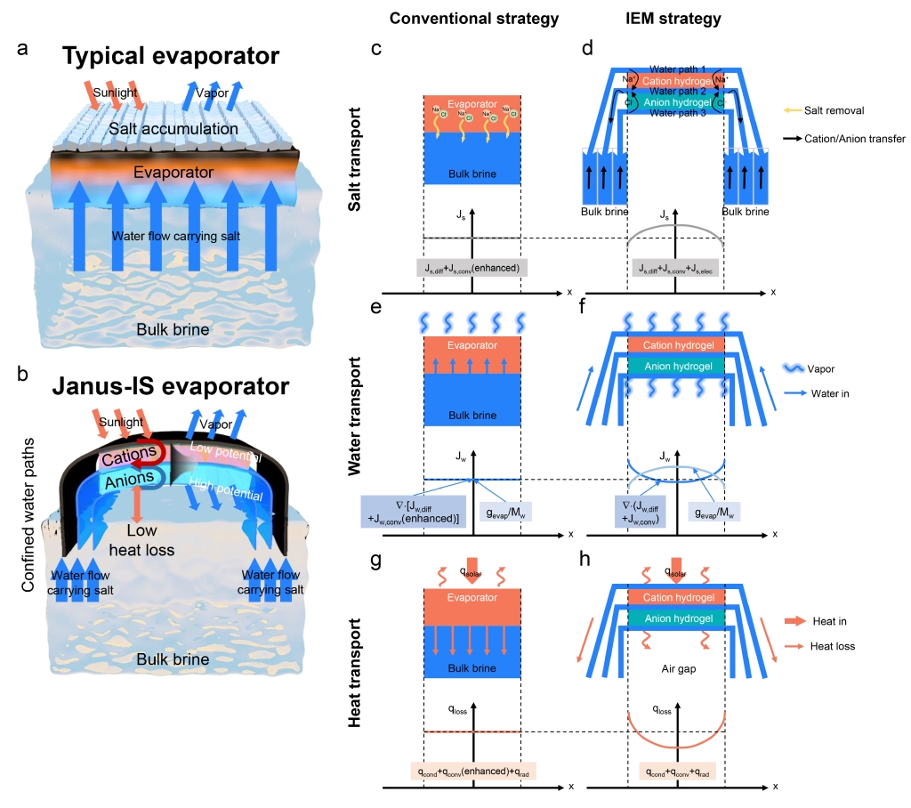 太阳能界面蒸发是一种新兴的海水淡化技术,其将蒸发器漂浮于海面上进行界面光热蒸发,具有绿色、零能耗、低成本和结构简单等诸多优势,有望解决全球性淡水短缺问题。但光热表面水汽化会造成盐分积累,严重阻碍其长期运行的稳定性。将光热层疏水化和强化对流传质是当前抗积盐的主要方法。前者避免海水到达光热层来防止积盐,但其同时增大了光热层与海水之间的热阻,降低蒸发速率。后者加快水对流从蒸发表面带走盐分,但同时也带走了热量,制约蒸发速率。因此,传统方法无法解决盐离子运移和高效热利用之间的矛盾,积盐问题仍是界面蒸发所面临的最严峻挑战之一。