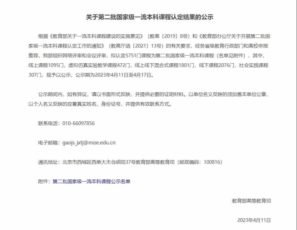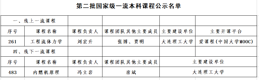 近日,教育部网站公示了第二批国家级一流本科课程认定结果(http://www.moe.gov.cn/jyb_xxgk/s5743/s5745/A08/202304/t20230411_1055217.html),全国拟认定5751门课程为第二批国家级一流本科课程,我校共有44门课程入选。其中,我院刘宏升教授(课程负责人)、张博教授和贾明教授主讲的《工程流体力学》,冯立岩教授(课程负责人)、唐斌教授主讲的《内燃机原理》分别认定为国家级线上一流课程和线下一流课程,实现了我院国家级一流课程的突破。