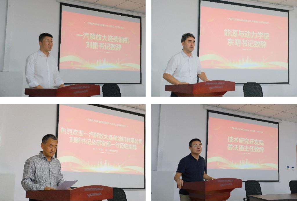 出席本次签署仪式的嘉宾包括一汽解放大连柴油机有限公司刘鹏副书记、动力总成产品设计部的苏欣部长、产品研发高级设计师段军博士、CAE分析主任工程师李明博士;大连理工大学出席的嘉宾有学院党委书记东明教授、校科研院产学研与成果转化办公室姜沃函主任、校图书馆馆长贾明教授,以及来自能源与动力学院师生代表。