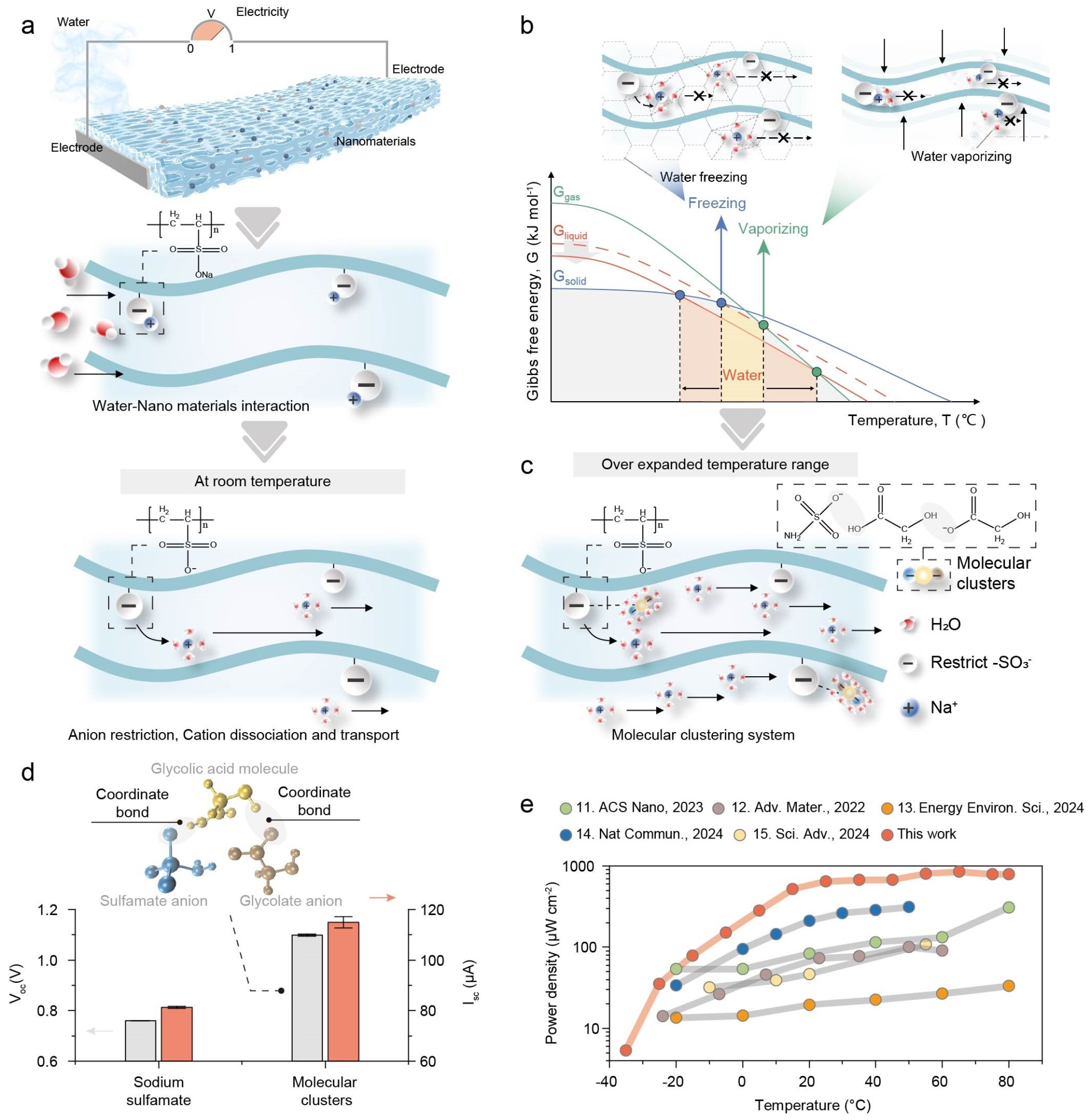 针对工作温域窄的问题,团队进一步提出分子引聚策略,通过分子尺度相互作用调控水分相变行为与离子传输特性。该策略构建有机盐-有机分子复合体系,使有机阴离子在有机分子周围形成稳定团簇结构。团簇化后阴离子表面电荷增强,显著提高其水分子结合能力,从而提高水的有效相变能垒,抑制高温条件下的快速蒸发损失及低温条件下的冻结失效。同时,阴离子被有机分子部分聚集后,体系中形成更多可自由迁移的阳离子载流子,降低离子间静电屏蔽效应,提升离子迁移率与有效电导率。通过协同调控传热过程中的相变动力学与传质过程中的离子迁移行为,相关水凝胶水伏器件的工作温域拓展至-35 °C至80 °C,功率密度较现有技术提升一个数量级。该水凝胶还具备优异的热稳定性和机械稳定性,在极端温度环境下仍能保持超过1000%的拉伸应变率。相关成果以“Molecular clustering unlocks high performance hydrovoltaics across temperatures from −35 °C to 80 °C”为题发表于Nature Communications。