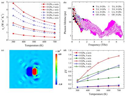 在超高压力条件下硒化锗热电性能调控方面:研究发现,硒化锗晶格热导率的压力依存性具有显著的各向异性,层间方向和层内armchair方向的晶格热导率随压力升高而增大,而层内zigzag方向晶格热导率则随压力升高而减小。高压下,硒化锗晶体的电子带隙和能带有效质量减小,电导率大幅提升。在8 GPa和700 K的条件下,层间方向、层内armchair以及zigzag方向的热电优值达到1.54、1.09和1.01,分别比常压热电优值提高了14、7.3和1.9倍。