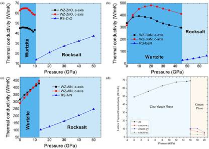 图1典型宽带隙半导体材料晶格热导率的压力依存性:(a) ZnO,(b) GaN,(c) AlN和(d) GaAs