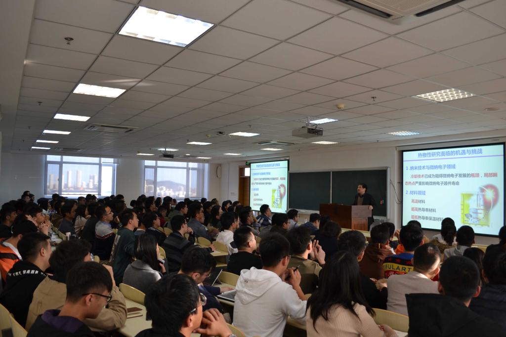 随后,在大家热烈的掌声中,张兴教授以“热物性领域中的原始创新”为题,讲述了热物性对自然界和产业界的重要意义与研究面临的机遇与挑战。张兴教授强调了原始创新的重要性,即原理创新、方法创新和技术创新,并且热情地讲解了他们课题组最新的研究进展及研究成果。张兴教授就“纳米尺度热物性研究”和“超临界氢混合物热物性研究”做的几点尝试展开了详细的讲解,主要有热、电、热电转换性能综合测量装置、双波长闪光拉曼热测量装置和改进膨胀法、定容法密度测量装置等。同时,张兴教授也提到了我们目前的测量装置有很大一部分依赖进口,受国外限制比较大,鼓励同学们自主创新,制造出我们自己的测量装置。
