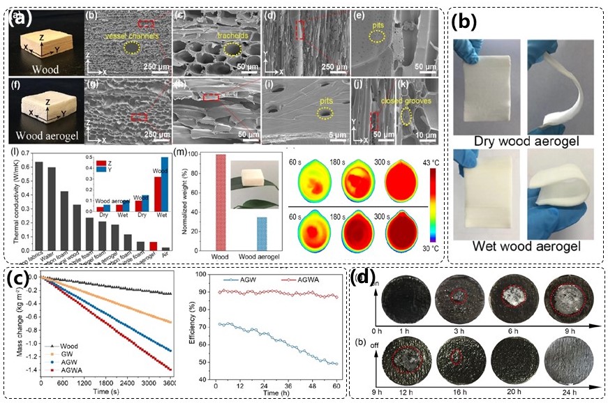 图4.(a)天然木材与木质气凝胶的微观结构和物理特性,(b)木质气凝胶蒸发体的光热转换性能,(c)木质气凝胶蒸发体的蒸发性能及耐久性,(d)木质气凝胶蒸发体的自排盐特性。