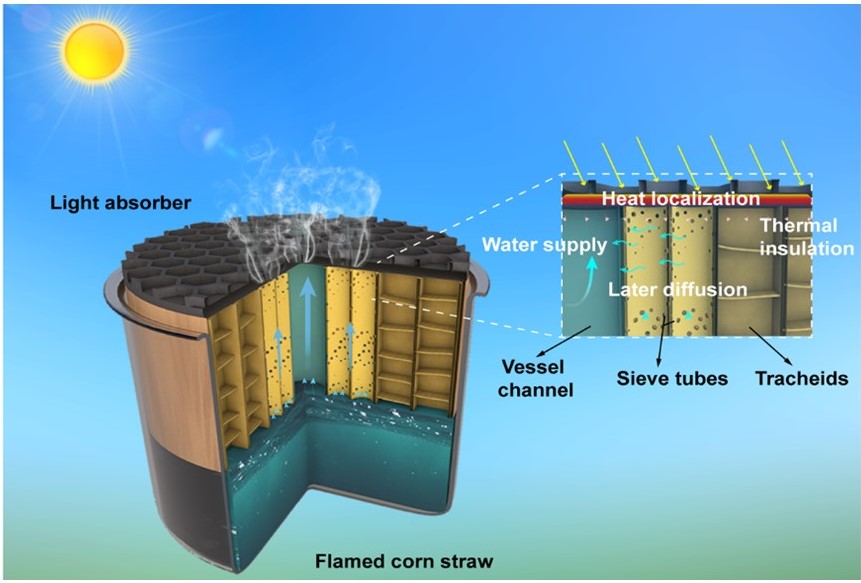 图1.基于玉米秸秆的太阳能界面蒸发体结构及工作原理示意图。