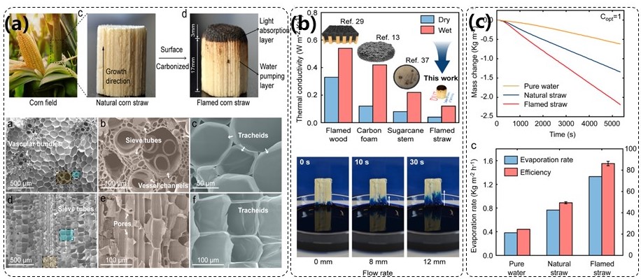 图2.(a)玉米秸秆蒸发体表面形貌及内部微纳结构,(b)玉米秸秆热导率及水输运能力,(c)玉米秸秆蒸发体的蒸发性能。