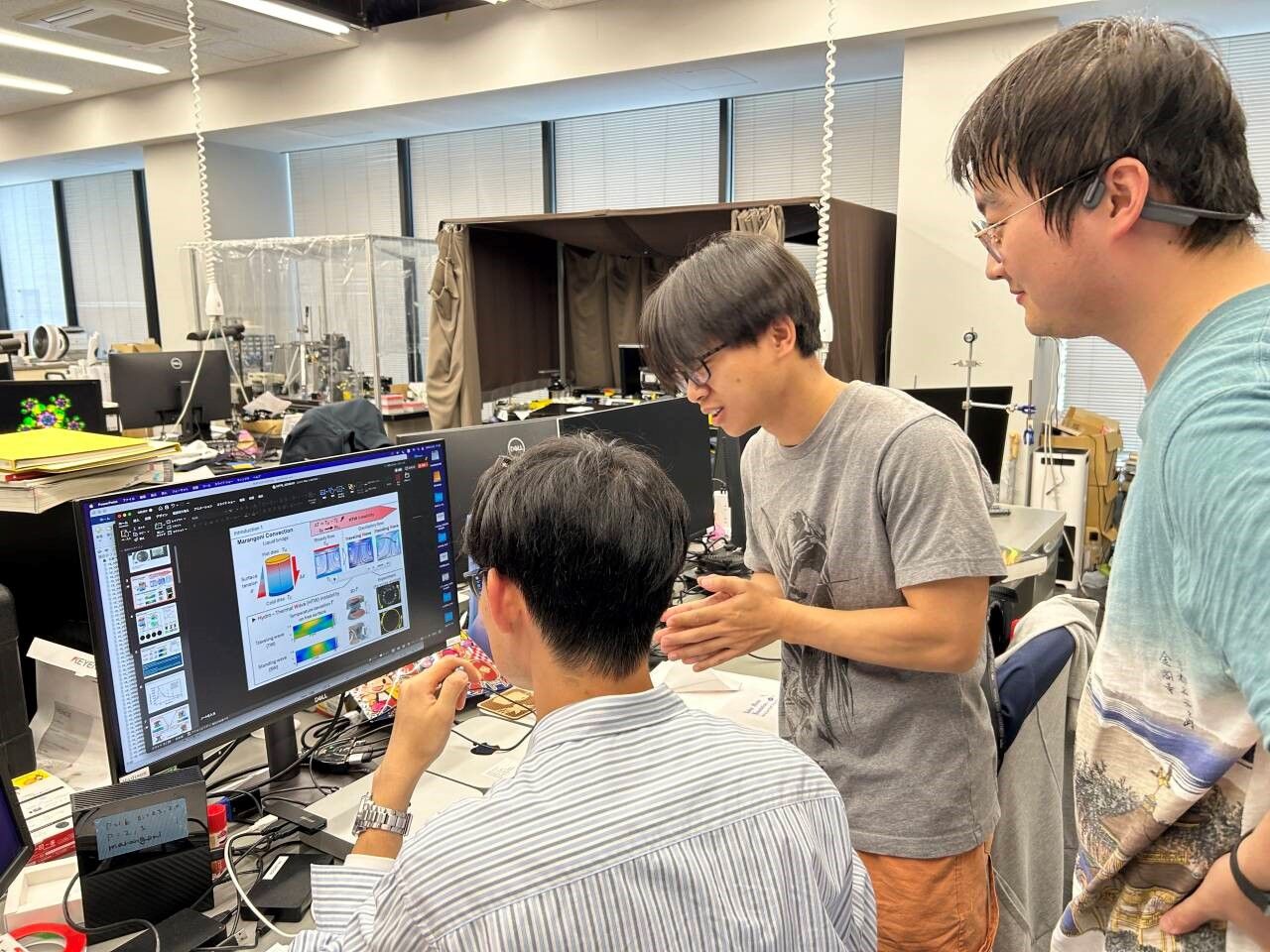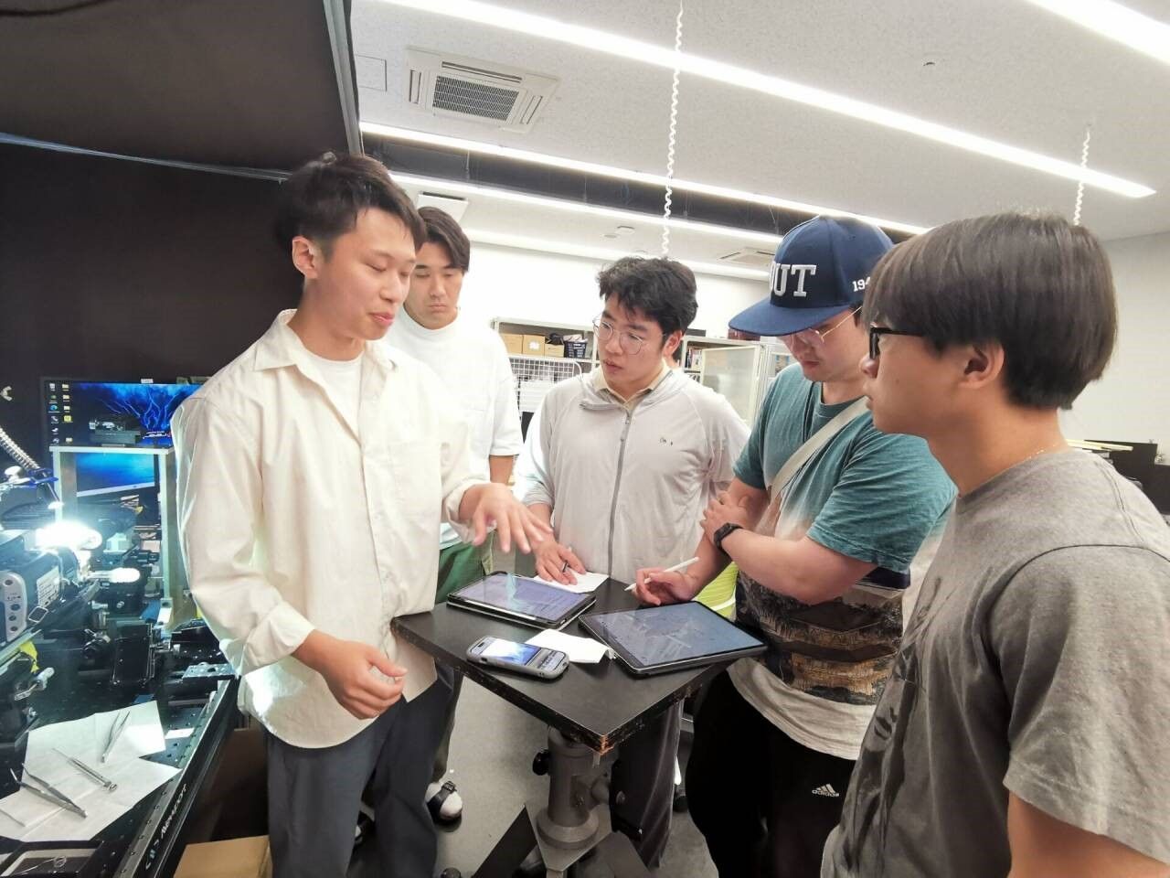 上野一郎教授所负责的上野研究室是东京理科大学的著名实验室,研究室成果辈出,获奖颇丰。其研究方向包括过冷池沸腾研究,温度和润湿性驱动的马兰戈尼效应的实验和流动模拟等,很多与贺缨教授实验室的研究方向相近。本次交流的重点放在了沸腾流动可视化技术和沸腾模拟的交流与学习。贺缨教授组成员包括博士生陈绘敏、硕士生尹凯和赵鹏飞。研究内容包含了数值计算、池沸腾实验和流动可视化技术等方向,上野教授组派出了主攻沸腾可视化实验研究和精通OpenFOAM 软件的一名博士和两名硕士生,并且为实验室参观和双方团队之间的交流精心安排了详细的日程表。上野教授团队学生首先带我们参观了温度驱动的马兰戈尼效应的实验装置,并且为我们展示了通过颗粒追踪测速法(Particle Tracking Velocimetry,PTV)获得的马兰戈尼效应下的流场变化;之后,研究生大竹同学带领我们参观了上野实验室的池沸腾装置。大竹同学不仅为我们展示了气泡微细化沸腾特征,还介绍了如何将过冷沸腾下的破裂小气泡作为示踪粒子观察流体运动的可视化方法。赵鹏飞同学则为上野实验室的同学展示了不同润湿表面下的单汽泡沸腾研究成果。双方都为各自精彩的实验结果所折服。尽管英语都不那么熟练,但同学们很快找到了共同话题。并且发现,原来图像处理、表面打磨、组件密封等看似简单的工作却都是各自实验中遇到的苦思冥想的难点。