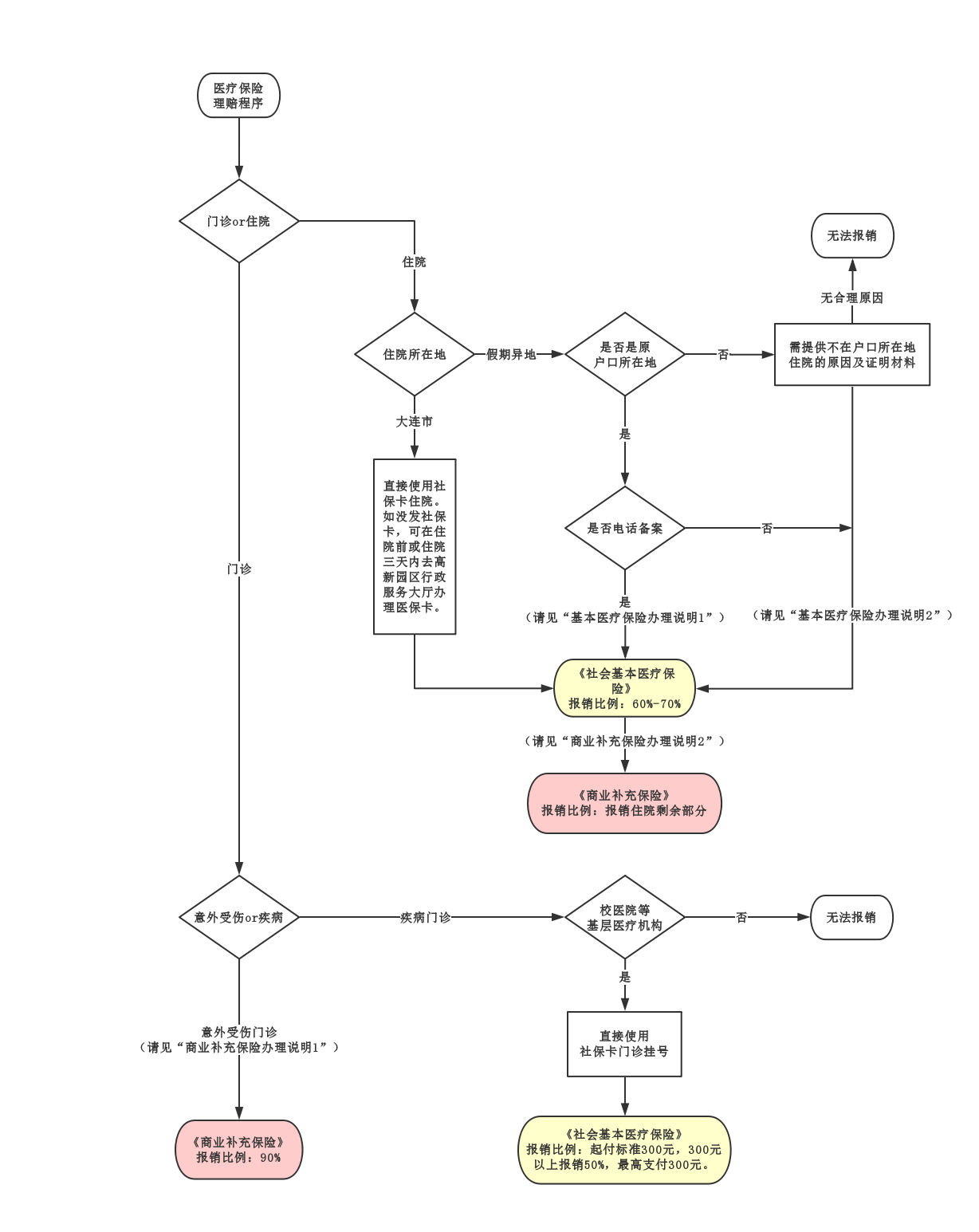(一)基本医疗保险办理说明1:学生在原户口所在地住院、且已在住院后向大连市医保中心打电话备案(0411-88857000-4-1)。