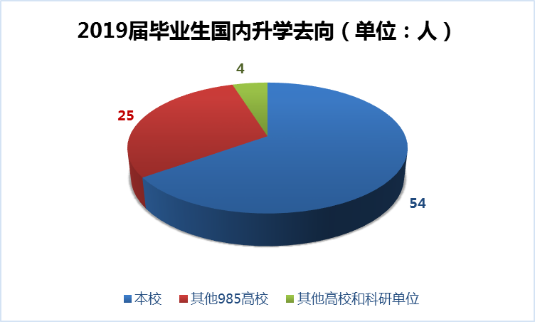 2019届毕业生国内成功升学总人数为83人,升学率为 48.26%,其中,本校读研比例为65.06%,外校读研比例为34.94%,主要集中在上海交通大学(10人)、浙江大学(5人)、西安交通大学(5人)等985高校。
