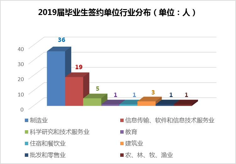 毕业生签约较多的行业依次是制造业,36人,占比53.73%;信息传输、软件和信息技术服务业,19人,占比30.65%;其他行业12人,占比19.35%。