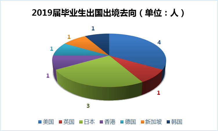 2019届毕业生出国出境深造人数为 12 人,占比6.98%。毕业生境外深造的国家和地区为美国、英国、日本、韩国、中国香港、新加坡、德国。